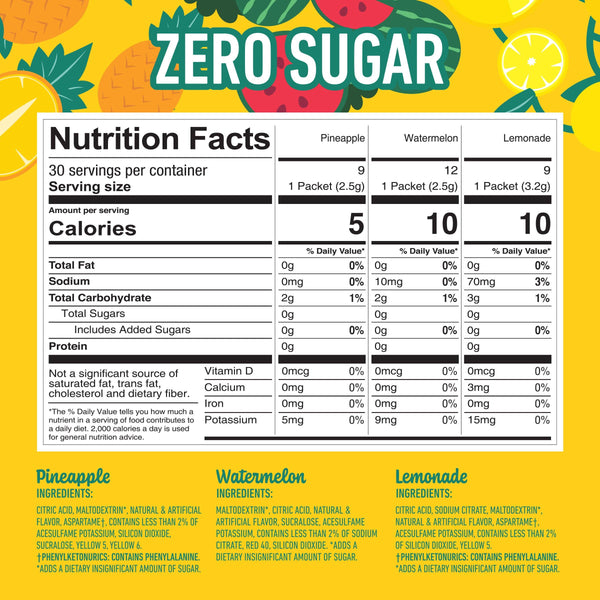 Crush Waterlemon Powder INGREDIENTS: MALTODEXTRIN, CITRIC ACID, NATURAL AND ARTIFICIAL FLAVOR, SUCRALOSE, ACESULFAME POTASSIUM, CONTAINS LESS THAN 2% OF SODIUM CITRATE, RED 40, SILICON DIOXIDE. Crush Lemonade Powder DP INGREDIENTS: Citric Acid, Sodium Citrate, Maltodextrin, Natural & Artificial Flavor, Aspartame†, Acesulfame Potassium, Contains less than 2% of Silicon Dioxide, Yellow 5. †PHENYLKETONURICS: CONTAINS PHENYLALANINE. Crush Pineapple Powder INGREDIENTS: CITRIC ACID, MALTODEXTRIN, NATURAL AND ARTIFICIAL FLAVOR, ASPARTAME†,, CONTAINS LESS THAN 2% OF ACESULFAME POTASSIUM, SILICON DIOXIDE, SUCRALOSE, YELLOW 5, YELLOW 6. †PHENYLKETONURICS: CONTAINS PHENYLALANINE.