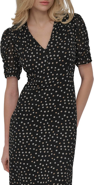 - Features: short sleeve, v-neck, midi dress, button front, fit and flare silhouette