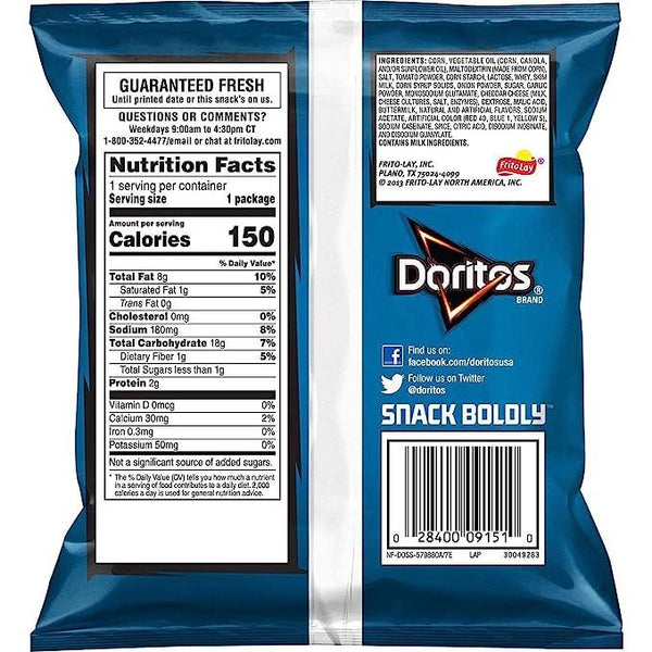 Corn, Vegetable Oil (Corn, Canola, And/or Sunflower Oil), Maltodextrin (Made From Corn), Salt, Tomato Powder, Lactose, Whey, Skim Milk, Onion Powder, Sugar, Garlic Powder, Monosodium Glutamate, Maltodextrin (Made From Corn), Cheddar Cheese (Milk, Cheese Cultures, Salt, Enzymes), Dextrose, Malic Acid, Corn Syrup Solids, Buttermilk, Natural and Artificial Flavors, Sodium Acetate, Artificial Color (Red 40, Blue 1, Yellow 5), Spice, Citric Acid, Disodium Inosinate, and Disodium Guanylate. CONTAINS MILK INGREDIENTS.