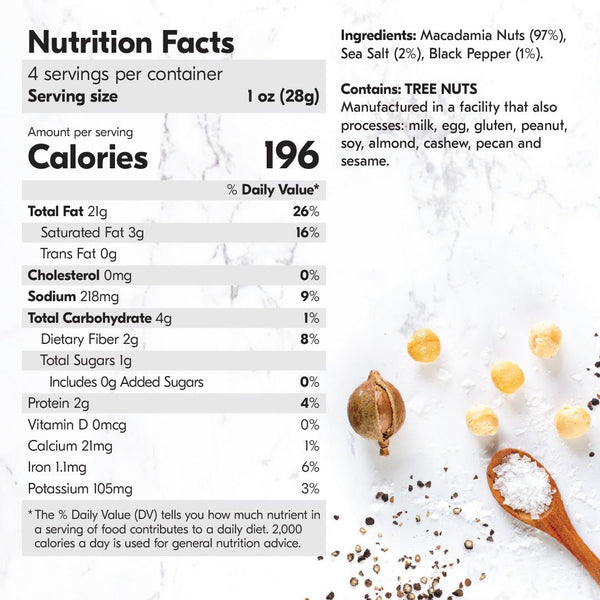 Macadamia Nuts (97%), Sea Salt (2%), Black Pepper (1%).