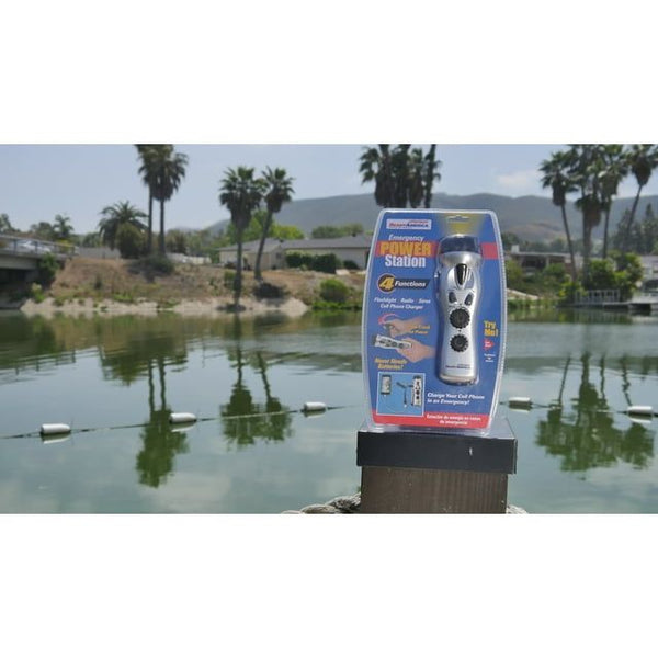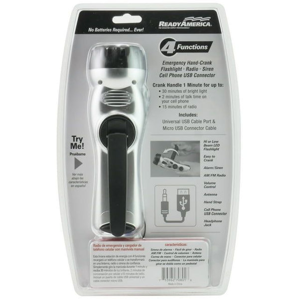 4 Function Emergency Power Station, 5 Lumens works as a flashlight, radio, siren, and cell phone charger. No batteries needed. Crank handle doubles as a stand. Crank for one minute for thirty minutes of bright light, and two minutes of talk time on your phone, and fifteen minutes of radio. Included are three free cell phone plugs for – iPhone (4S & earlier), * usb, * mini usb