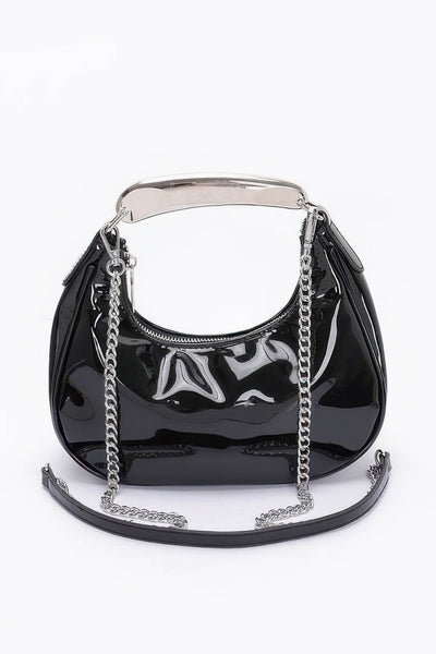 Refined and modern, the Enamel Metal Handle Bag brings a polished finish to any occasion. Crafted from smooth polyurethane with mixed metal accents, this structured clutch is elevated by its gleaming enamel metal handles in a mix of gold and silver tones. A detachable chain strap adds styling versatility, allowing you to wear it over the shoulder or carry it as a statement piece. With its clean lines and compact design, this bag transitions seamlessly from formal events to elegant evenings out. A standout accessory for those who appreciate bold yet timeless style.