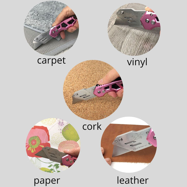 Ergonomic and Anti-Slip Grip . New and improved version of our classic and highly popular foldable utility knife in pink. We designed it for customers who were looking for a strong but lightweight, easy-to-fold, easy-to-open utility knife with a lock-feature, a carabiner clip and a belt hook. The ergonomic design ensures ease of use with minimal strain on the hand.