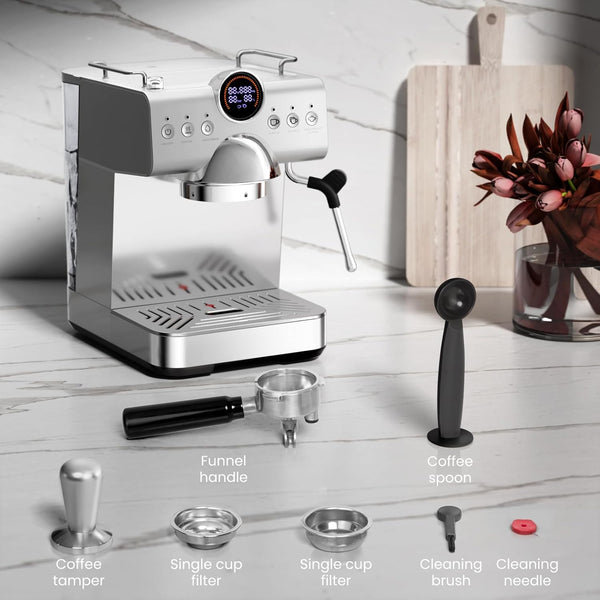 • 【Portable & Compact Design】Designed for convenience, High-Quality expresso coffee maker features a 1.5L detachable water tank for easy refills and a built-in cup warmer on top, professional accessories and cleaning tools ensure a perfect coffee experience with 20-bar espresso machine.