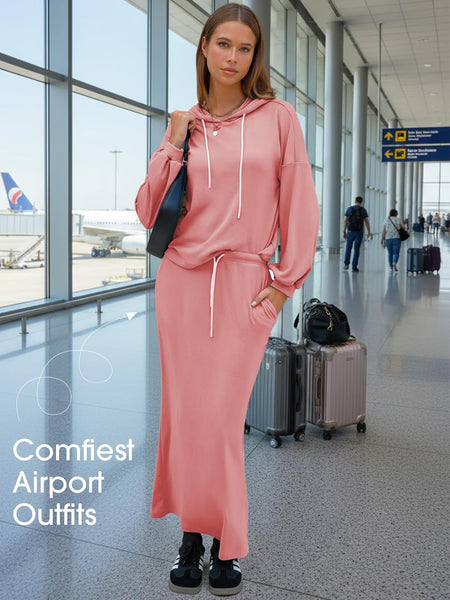 - Design: You will love the solid color hoodies pullover with drawstring design, matching elastic waist long skirt has pockets and drawstring to match all figures adjustment, fashion aesthetic clothing. sweatshirt skirt jogger set, fall clothes for women, winter dresses for women 2025, lounge sets for women 2 piece, womens sweatsuits 2 piece set, women's athletic clothing sets, track suits for women set, winter travel outfit, maxi skirt sweatsuit, knit skirt and hoodie