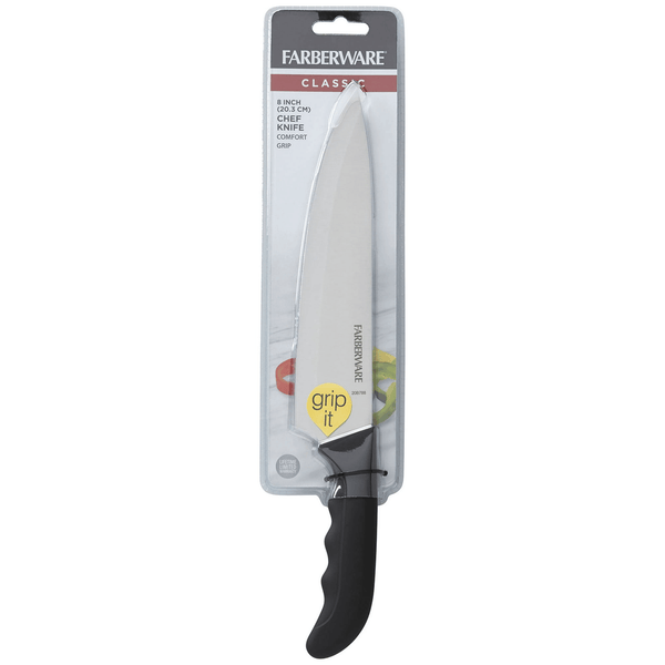 The farberware 8-inch comfort grip chef knife in black has high-carbon stainless steel blades that provide strength and durability. It has an ergonomically designed handle that helps the knife that is perfectly balanced for comfort and control while in use. This knife is great for cutting a variety of different foods.