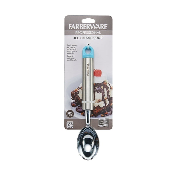 Create uniform scoops of frozen desserts every time with this Farberware Professional Aqua Sky Ice Cream Scoop. The strong and durable stainless steel head glides smoothly through ice cream, sherbet, gelato, sorbet, and other frozen treats, while the sleek, attractive, stainless steel handle offers a plastic aqua sky loop on the end for hanging storage. Measures 8-3/4 inches long. Dishwasher safe.