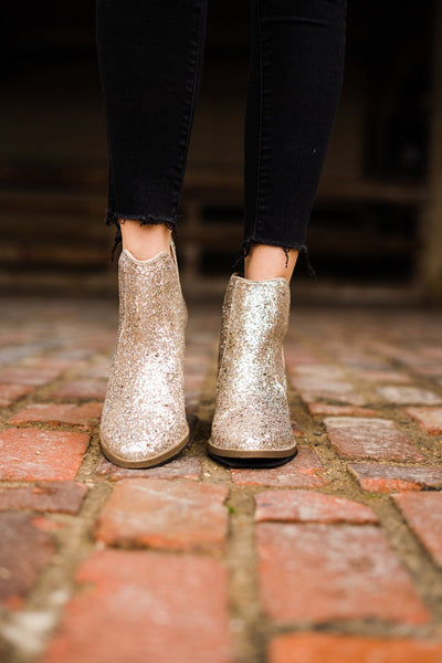 Some of our best selling booties last year were the charcoal version of these. They are back in gold! NOTHING quite says 'I'm here for the party' like a pair of glitter booties.