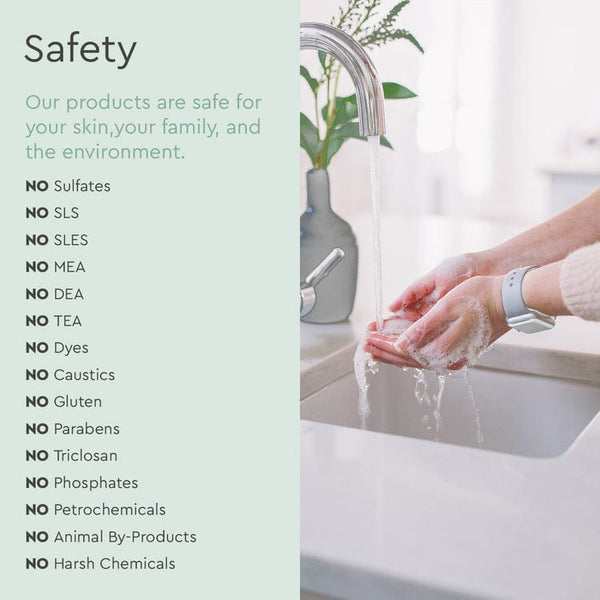 - NO sulfates (e.g. SLS, SLES), triclosan, parabens, phthalates, phosphates, animal by-products, perfumes, petrochemicals, dyes, or caustics