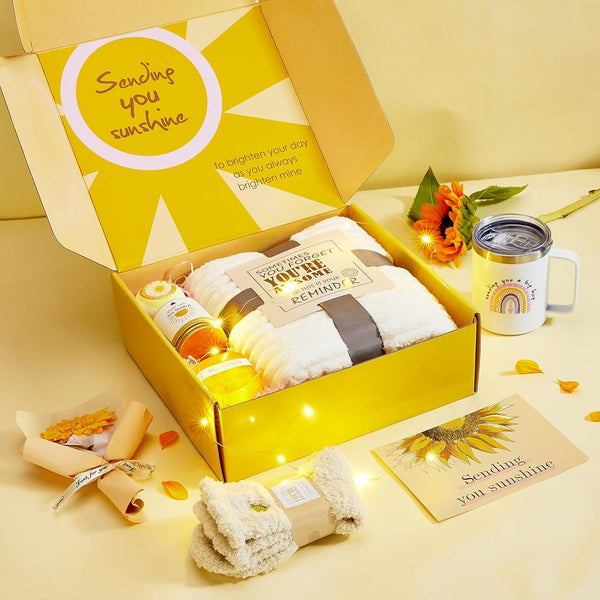 - Meaningful Care Package for Women: Express your deepest support with uplifting and cheerful elements. It includes vibrant sunflower gifts for women like a beautiful bouquet to brighten her spirit and enhance her mood, along with an elegant blank greeting card where you can add a personalized message of love and encouragement. This thoughtfully designed care package for women offers joy when it's needed most and can also serve as comforting sympathy gift baskets.