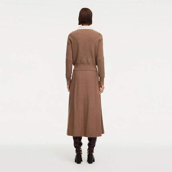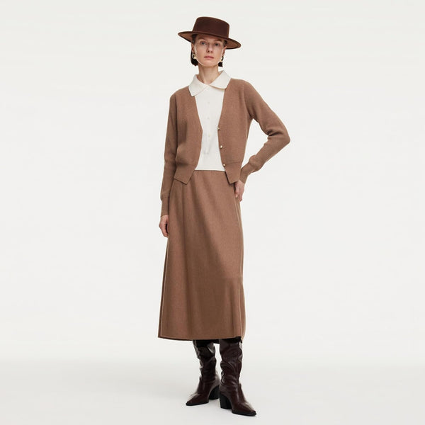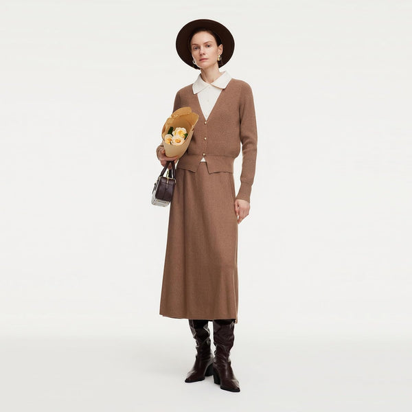 - FEATURES - This knit skirt two piece sets pair a faux two-piece top with a flowing A-line skirt. The slim-fit knit top features a waist-defining shape, a flattering V-neck and a contrast shirt collar for layered depth. Metal buttons at the front placket add subtle shine and can be opened, while cuffed sleeves ensure comfort. The mid-calf A-line skirt offers ease and versatility, with a clean knit waistband for a polished, effortless look