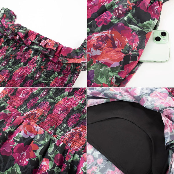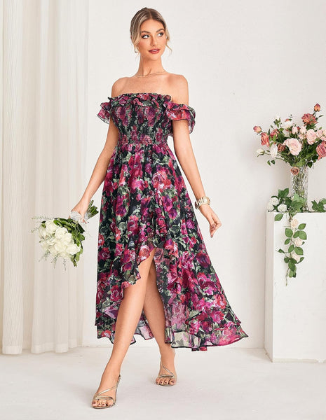 GRACE KARIN Women's Floral Print Maxi Dress Off Shoulder Smocked A Line Flowy Ruffle Wedding Guest Dresses with Pockets