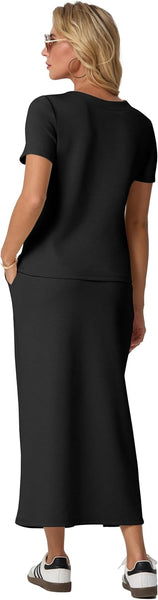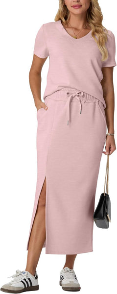 - [Focal Point] Two piece outfits: V-neck, short sleeve top with a relaxed fit, paired with an elastic waist midi skirt featuring a single side slit and two side pockets. Perfect for any shoe style, from sneakers to sandals and heels.