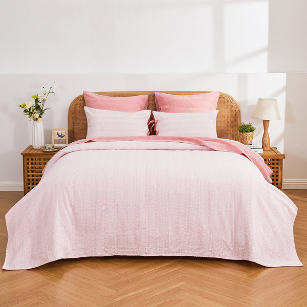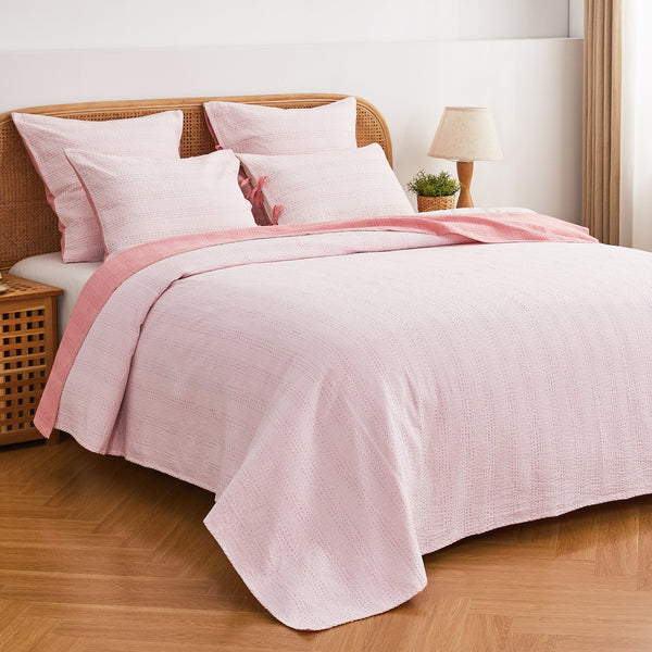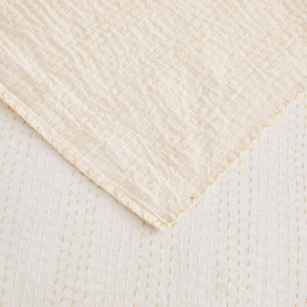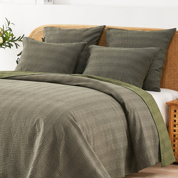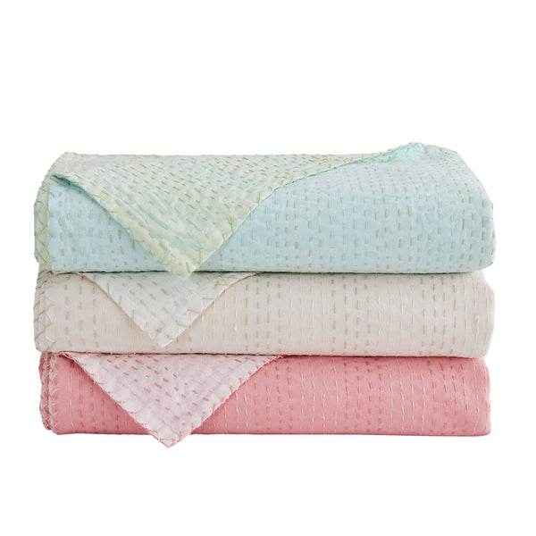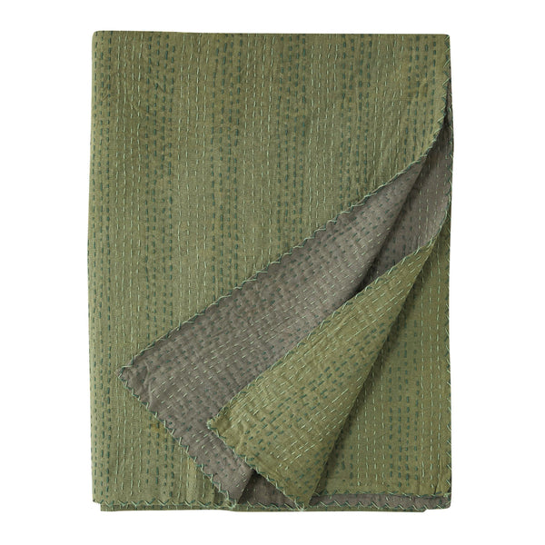 Our handmade coverlet features two coordinating colors. The cotton fabric is stitched by hand to create a unique, lightweight layer. Due to the handmade nature of this coverlet, variations will occur in the dying and stitching.