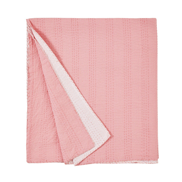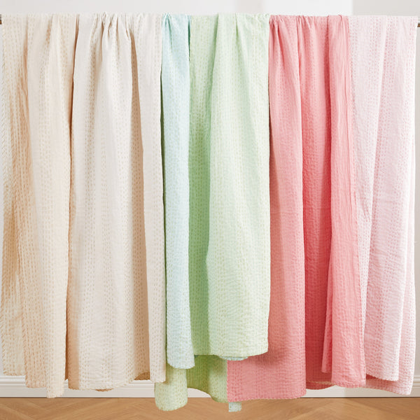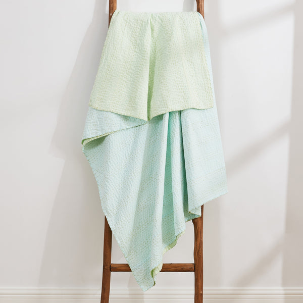 Our handmade throw features two coordinating colors. The cotton fabric is stitched by hand to create a unique, lightweight layer. It makes a great accent on a sofa or chair and can even be used as a tablecloth. Due to the handmade nature of this throw, variations will occur in the dying and stitching.