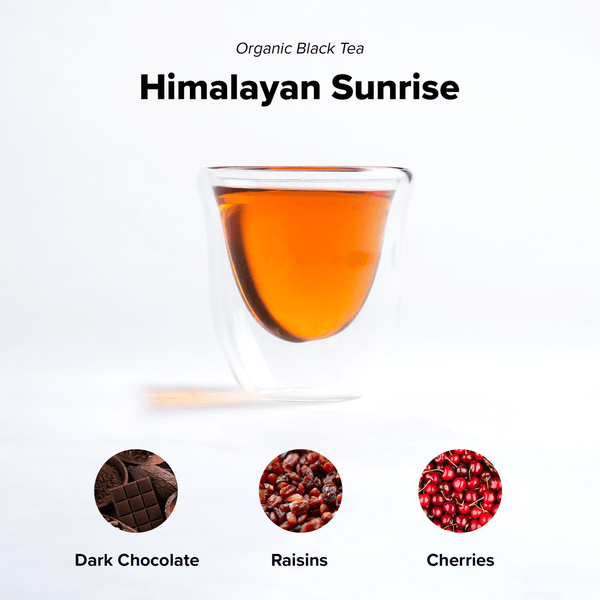 Himalayan Sunrise is a brisk Nepal black tea with fruity and floral aromas, with hints of caramel. Flavor notes of raisins, cherry, and dark chocolate are prominent in this unique tea.