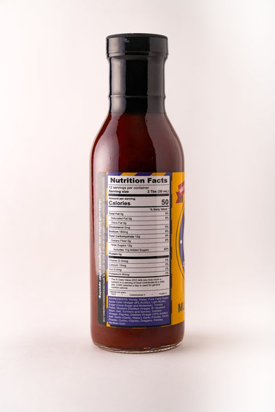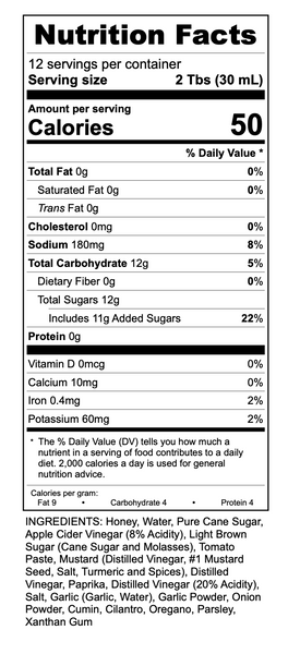 Ingredients: Honey, Water, Pure Cane Sugar, Apple Cider Vinegar (8% Acidity), Light Brown Sugar (Cane Sugar and Molasses), Tomato Paste, Mustard (Distilled Vinegar, #1 Mustard Seed, Salt, Turmeric and Spices), Distilled Vinegar, Paprika, Distilled Vinegar (20% Acidity), Salt, Garlic (Garlic, Water) Garlic Powder, Onion Powder, Cumin, Cilantro, Oregano, Parsley, Xantham Gum