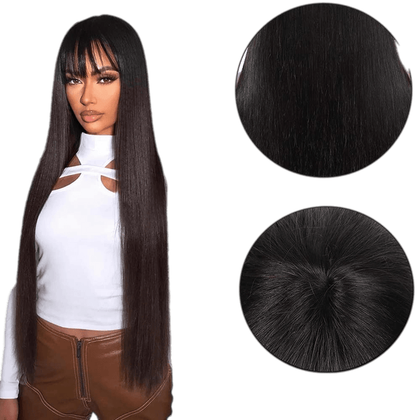 Designed for versatility, the straight texture combined with customizable bangs offers a chic, modern look suitable for any setting. The bangs are slightly longer, giving you the flexibility to trim and shape them to perfectly frame your face, ensuring a personalized fit every time. The natural black color provides a sleek, sophisticated backdrop that can be dyed, curled, straightened, or styled to match your unique preferences.