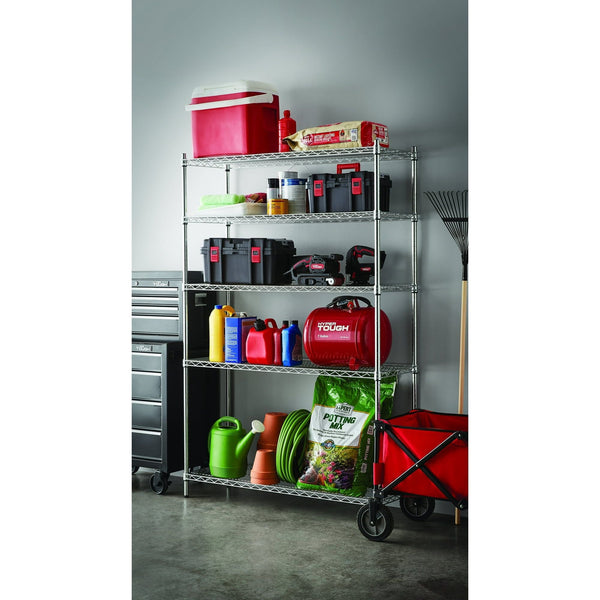 The Hyper Tough 5-Shelf Heavy Duty Wire Shelf Unit is ideal for industrial and commercial use. It has strong and durable welded wire construction in chrome color. Open wire design allows air circulation and reduces dust build-up. It is NSF certified for dry environment and comes with a five-year limited warranty. Shelves can be adjusted in 1-inch increments and can hold up to 600 pounds evenly distributed. The adjustable feet levelers help make it easier to place on uneven flooring while keeping the shelf level and stable. It is designed for adult use. This wire shelving system is perfect for homes, offices, restaurants and any other places you need to organize. Check out other Hyper Tough products like socket sets, trimmer line, toolboxes, drills, drivers and more. Keep your space organized with the Hyper Tough 5-Shelf Heavy Duty Wire Shelf Unit.