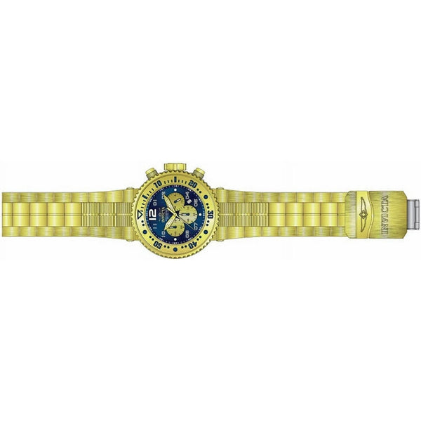 Blue dial enhanced by luminous yellow gold-tone hands. Yellow Gold-plated stainless steel case with a yellow gold-plated stainless steel band. Quartz movement. 500 meters / 1650 feet water resistance. Uni-directional Rotating bezel. Scratch Resistant Mineral crystal. Solid caseback. Deployment with Push Button Release clasp. Screw Down crown. Case size 52 mm x 20 mm. Band 29.3 mm x long. Invicta 25077 Pro Diver Watch.