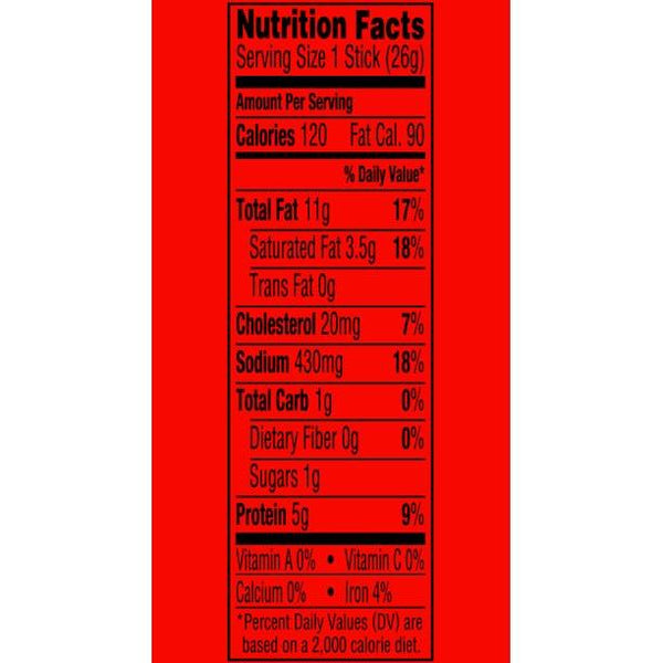 Beef, Water, Salt, Contains 2% or Less of Sugar, Flavors, Yeast Extract, Lactic Acid Starter Culture, Casing (Caramel, Beta Carotene).