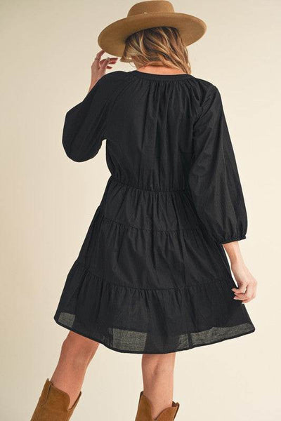Effortless and chic Jenay dress features a flattering V-neck, a swing shape for easy movement, and 3/4 sleeves for a touch of elegance. The tiered design adds playful flair, while pockets offer both style and convenience.