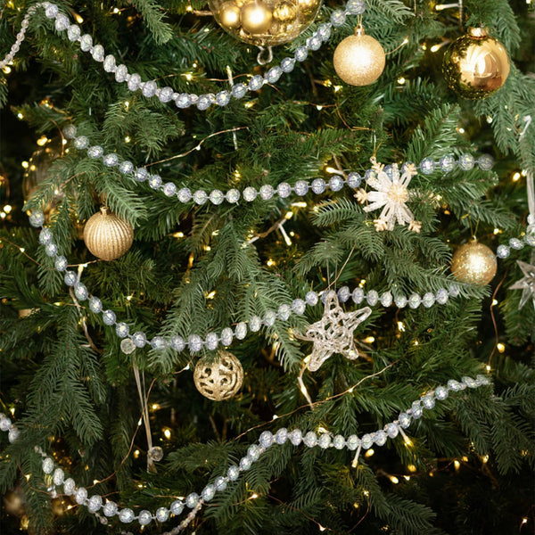 - CRYSTAL BEAD GARLAND FOR CHRISTMAS TREE DECORATIONS 99 FT VALUE PACK: Our crystal garland strand is clear iridescent color faux flat round diamond shaped acrylic plastic crystal beads on a string craft roll. Each crystal beads is 10mm in diameter, and connected with string. Single 99ft long, easy to cut to any length to meet any decorative needs.
