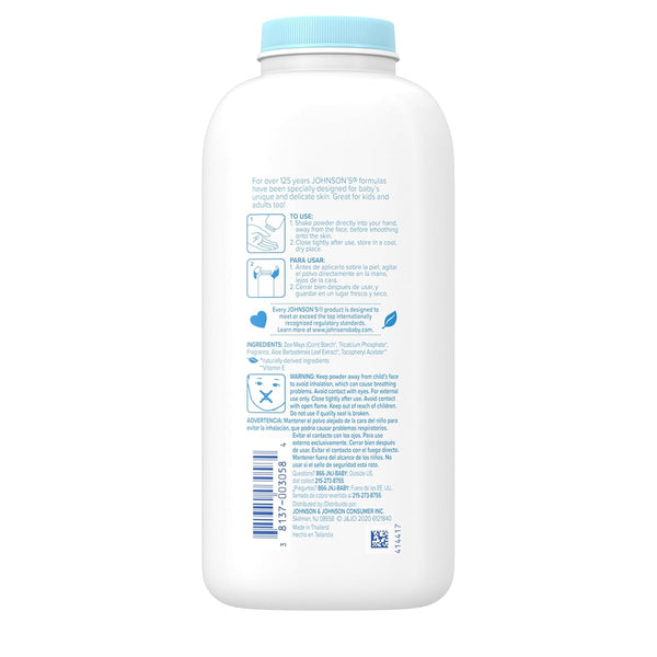 Johnson's baby powder with naturally derived cornstarch and Aloe & Vitamin E gently absorbs moisture to soothe baby's delicate and unique skin and leaves it feeling soft and smooth. Specially formulated for babies and infants, this soothing baby powder is dermatologist tested and clinically proven mild and gentle. This hypoallergenic baby powder is free of parabens, phthalates, dyes, and harsh fragrances. Formulated to be gentle, never harsh, this lightweight cornstarch baby powder for baby skin care has a silky texture for easy application. It's great for kids and adults, too! To use this infant baby powder, shake powder directly into your hand away from the face before smoothing onto skin. Close the baby powder container tightly after use and store in a cool, dry place.