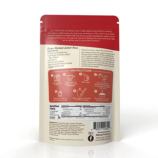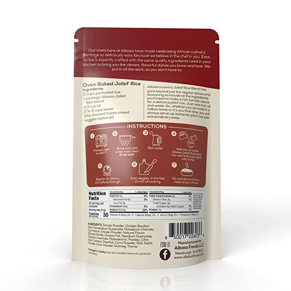 Albasa’s savory Jollof Rice blend goes beyond the regular spices and seasoning to include all the ingredients you’ll need to make a rich tomato sauce for a mouth-watering jollof rice. Just add rice, water, and oil or butter and serve up authentic jollof rice with extraordinary ease. Serve with any meat of your choice.
