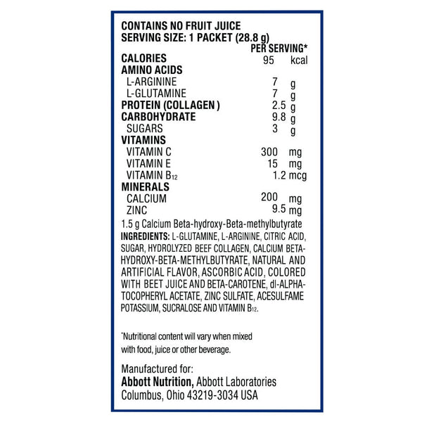 Ingredients: L-Glutamine, L-Arginine, Citric Acid, Sugar, Hydrolyzed Beef Collagen, Calcium Beta-Hydroxy-Beta-Methylbutyrate, Natural & Artificial Flavor, Ascorbic Acid, Colored with Beet Juice and Beta-Carotene, dl-Alpha-Tocopheryl Acetate, Zinc Sulfate, Acesulfame Potassium, Sucralose, and Vitamin B12.