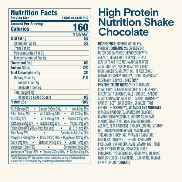 Ingredients: Purified Water, Pea Protein*, Contains 2% or Less of: Dutch Cocoa Powder (Processed with Alkali)*, Monk Fruit Extract*, Stevia Leaf Extract (Reb M)*, Natural Flavor*, Agave Inulin*†, Acacia Gum*, Oat Fiber*, High Linoleic Sunflower Oil*, Flaxseed Oil*, Brown Rice Syrup Solids*†, Locust Bean Gum*, Rosemary Extract*, Spectra™ Phytonutrient Blend*†: (Extracts and Concentrates from: Broccoli*, Coffeeberry®*, Green Tea*, Turmeric*, Kale*, Broccoli Sprout*, Acai*, Cinnamon*, Garlic*, Tomato*, Blueberry*, Carrot*, Beet*, Raspberry*, Spinach*, Tart Cherry*, Blackberry*)