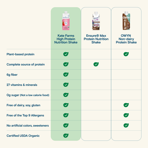 Unique among high protein nutritional shakes, Kate Farms explicitly supports use alongside GLP-1 therapies: with 25 g protein at only 160 calories, it helps provide nourishment when appetite is reduced. Because it is plant-based, allergen-free, and clean label, it appeals to both health-driven consumers and clinical markets.