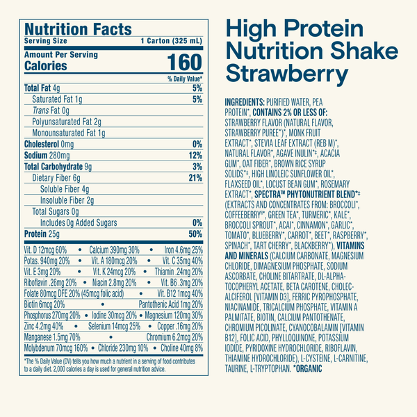 Ingredients: Purified Water, Pea Protein*, Contains 2% or Less of: Strawberry Flavor (Natural Flavor, Strawberry Puree*)*, Monk Fruit Extract*, Stevia Leaf Extract (Reb M)*, Natural Flavor*, Agave Inulin*†, Acacia Gum*, Oat Fiber*, Brown Rice Syrup Solids*†, High Linoleic Sunflower Oil*, Flaxseed Oil*, Locust Bean Gum*, Rosemary Extract*, Spectra™ Phytonutrient Blend*†: (Extracts and Concentrates from: Broccoli*, Coffeeberry®*, Green Tea*, Turmeric*, Kale*, Broccoli Sprout*, Acai*, Cinnamon*, Garlic*, Tomato*, Blueberry*, Carrot*, Beet*, Raspberry*, Spinach*, Tart Cherry*, Blackberry*)