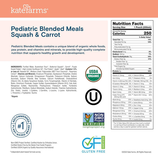 Kate Farms Pediatric Blended Meals, Squash & Carrot is thoughtfully crafted to provide complete, plant-based nutrition for children who require tube feeding or oral supplementation. Designed with pediatric needs in mind, this nutrient-rich blend features organic squash and carrots as the foundation, delivering both wholesome flavor and essential vitamins. Each serving is made with USDA Organic ingredients, is non-GMO, and free from dairy, soy, gluten, and artificial additives—making it gentle on sensitive tummies.