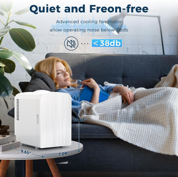 - 4L CAPACITY: Store 6 can/12 oz with no worry; dimensions are 9.65"D x 7.09"W x 10.24"H; The removable shelf makes the fridge become more flexible to store small items like breast milk, skincare, cosmetic, or food.