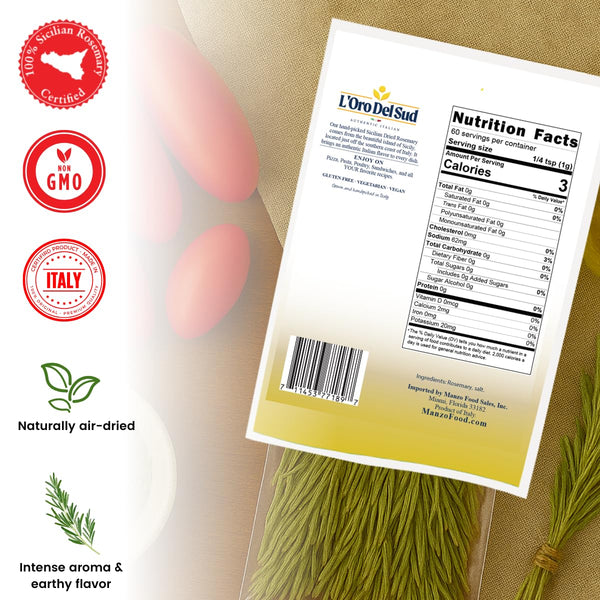 Bring the fragrant, earthy aroma of Sicily to your kitchen with L’Oro Del Sud Sicilian Rosemary Leaves. Harvested under the warm Mediterranean sun, this premium rosemary is dried to perfection, preserving its intense herbal flavor and natural oils.