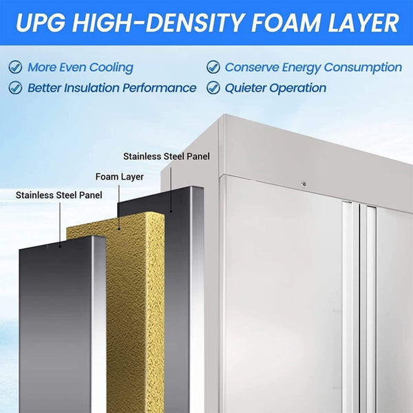 - This outstanding commercial freezer features a sturdy stainless steel interior and exterior, craftily designed for enduring commercial use. Additionally, its thickened foam layer ensures superior insulation, cutting down both energy expenditure and noise.