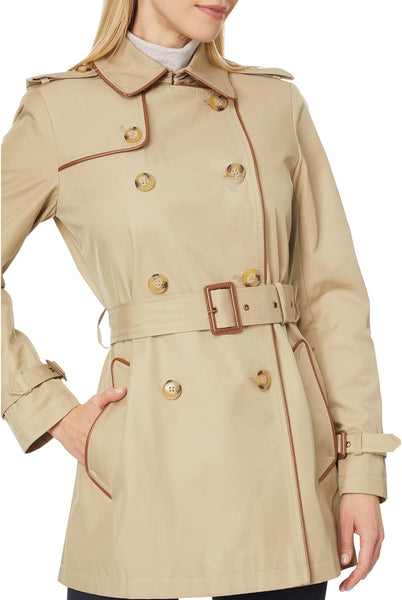 - Stay true to your classic style in the chic LAUREN Ralph Lauren Belted Db W Pu Trim30" coat. Featuring a spread collar with a double-breasted front button-closure, long sleeves with buckled tabs at the cuffs, buttoned shoulder epaulets, and side hand