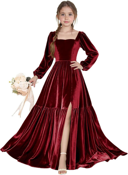 - Girls Fall Winter Dresses: girls formal dress of graceful style, square neckline, long sleeve flower girl dress. This girls wedding guest dress features gorgeous flared skirt with slit