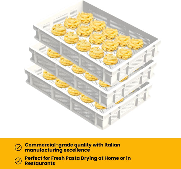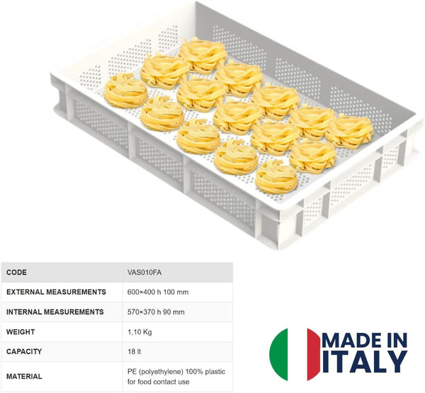 Optimize your pasta-making process with the L'Oro Del Sud Perforated Drying Tray, designed for efficient and even drying of fresh pasta. Made in Italy and compliant with European directives, this stackable bin is perfect for artisanal pasta makers, bakeries, and professional kitchens.