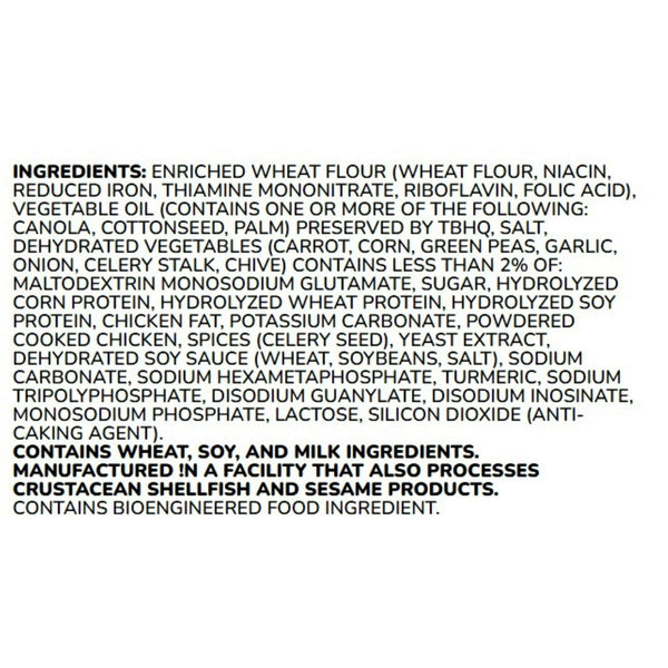 ENRICHED WHEAT FLOUR (WHEAT FLOUR, NIACIN, REDUCED IRON, THIAMINE MONONITRATE, RIBOFLAVIN, FOLIC ACID), VEGETABLE OIL (CONTAINS ONE OR MORE OF THE FOLLOWING: CANOLA, COTTONSEED, PALM) PRESERVED BY TBHQ, CONTAINS LESS THAN 1% OF: SALT, SOY SAUCE (WATER, WHEAT, SOYBEANS, SALT), POTASSIUM CARBONATE, SODIUM (MONO, HEXAMETA, AND/OR TRIPOLY) PHOSPHATE, SODIUM CARBONATE, TURMERIC. SOUP BASE INGREDIENTS: SALT, SUGAR, MONOSODIUM GLUTAMATE, MALTODEXTRIN, CONTAINS LESS THAN 1% OF: SPICES (CELERY SEED), HYDROLYZED CORN, WHEAT AND SOY PROTEIN, TURMERIC, LACTOSE, NATURAL FLAVORS, DEHYDRATED VEGETABLES (CHIVE, GARLIC, ONION), DISODIUM INOSINATE, DISODIUM GUANYLATE, VEGETABLE OIL (PALM), YEAST EXTRACT, POWDERED COOKED CHICKEN.