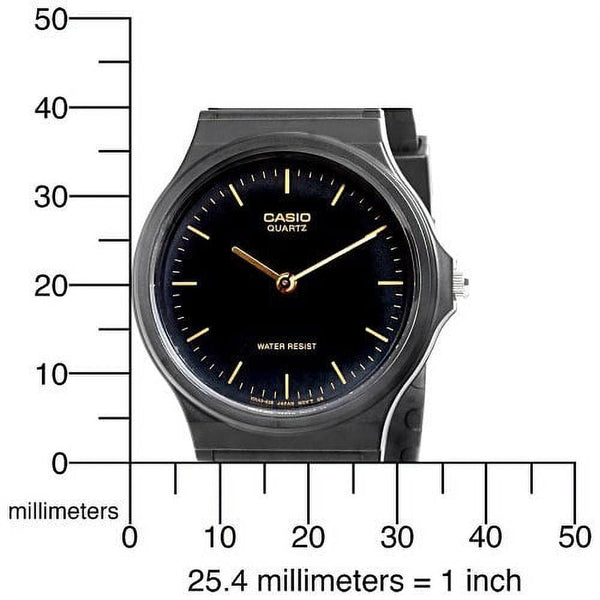 Simple and easy to use design, this Casio men's watch features a round black dial with gold tone hands and stick hour markers. All of these are framed in a black resin case, push crown and protected by mineral crystal. It also offers a black resin strap secured with buckle closure, Japan quartz movement and is water resistant