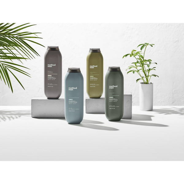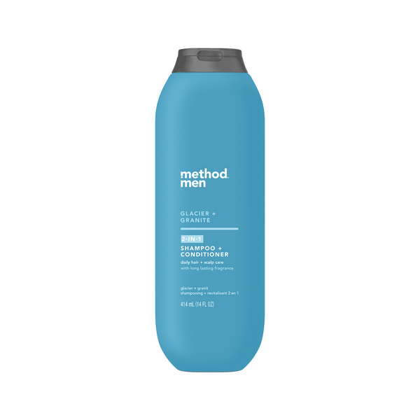 Method Men 2 in 1 Shampoo + Conditioner, Glacier + Granite, 14 Fluid Ounces - Combined shampoo + conditioner with plant-based cleansers and conditioners. Want clean, conditioned hair without the fuss? This daily shampoo and conditioner gets the job done in a jiffy. Made with water, refreshing menthol and an infusion of argan + jojoba oil ingredients, it's nourishing, cleans and conditions your hair and scalp in one simple, sensationally scented step. Refreshingly bright + brisk, this crisp, fresh fragrance unleashes your inner artic explorer. We're dedicated to clean, thoughtful design, inside and out, from beautifully practical packaging to effective people-friendly formulas. Life is complicated enough, staying clean and fresh doesn't have to be.