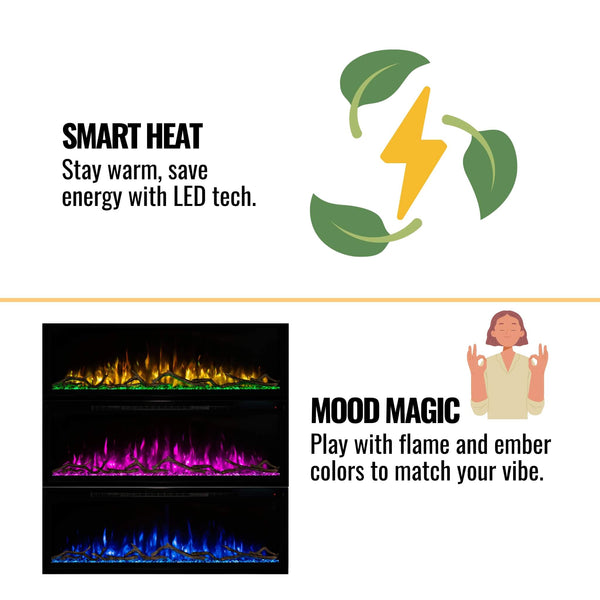Set the timer to turn off the fireplace automatically, and enjoy effortless control with the push-button panel or the included remote.
