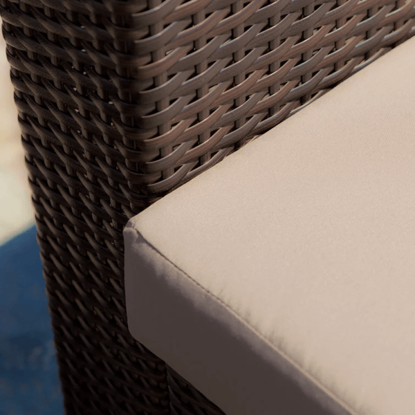 - Each chair is crafted with water-resistant tan cushions that offer lasting comfort and refined style, making it ideal for all-season outdoor lounging.