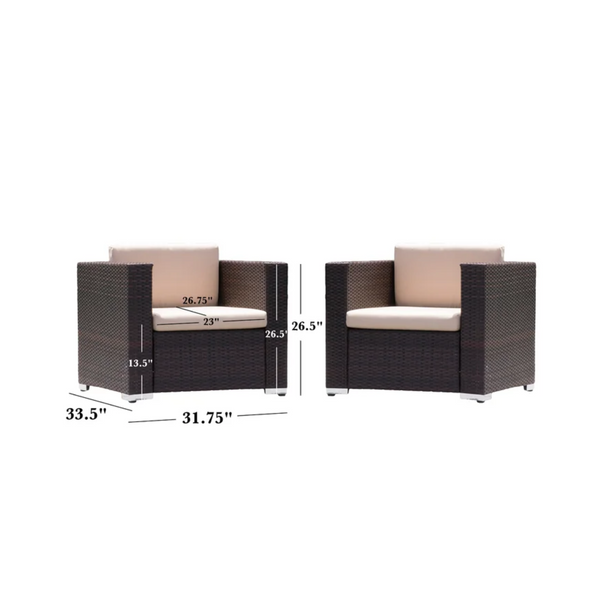 Transform your patio or garden into a haven of style and comfort with the Modern Rattan Outdoor Water-Resistant Wicker Patio Chairs. Thoughtfully designed for outdoor relaxation, this set of two chairs combines contemporary elegance with durability. Featuring a sophisticated brown multitone rattan weave and plush tan cushions, these chairs are perfect for entertaining guests or enjoying a peaceful coffee on a sunny morning. With water-resistant cushions and a robust metal frame, they’re built to withstand the elements while offering timeless charm and luxurious seating year-round. Sit back, relax, and elevate your outdoor living experience today!