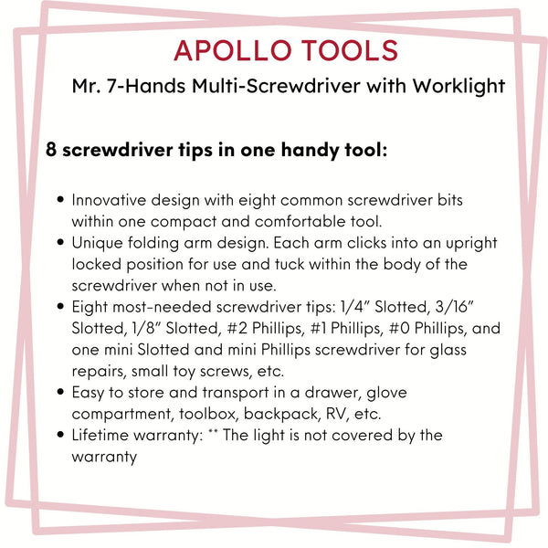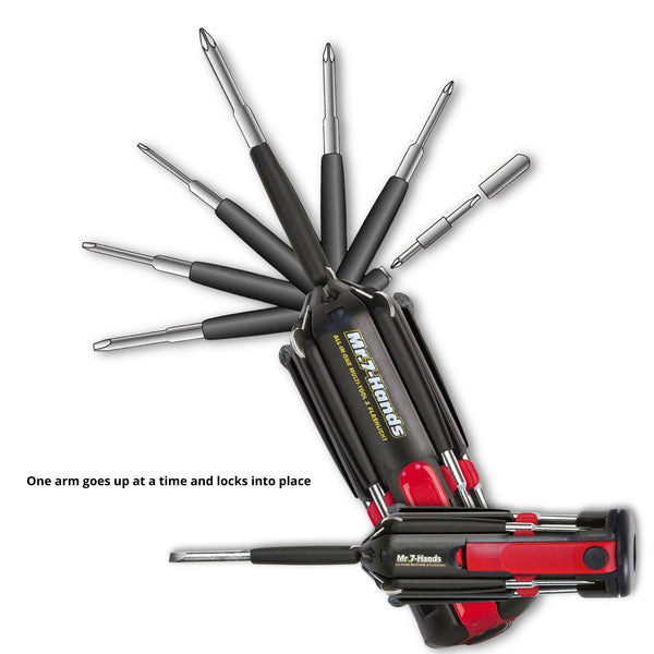 APOLLO TOOLS’ PATENTED Mr. 7-Hands multi-screwdriver has a unique folding arm design. Each arm folds down and clicks as it is tucked within the body of the screwdriver when not in use, and clicks into an upright locked position for use.