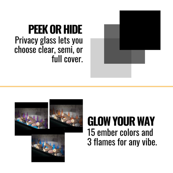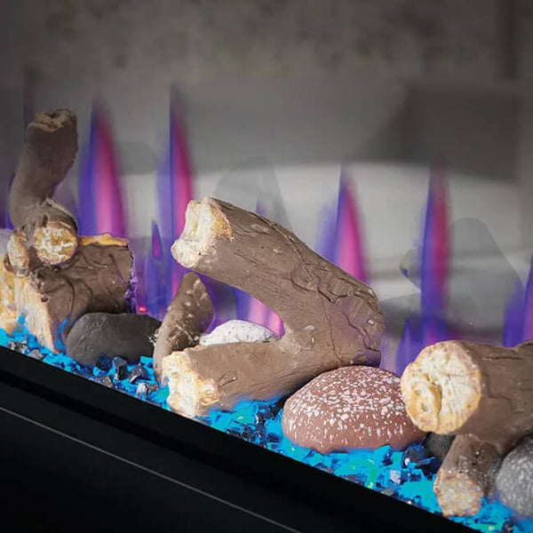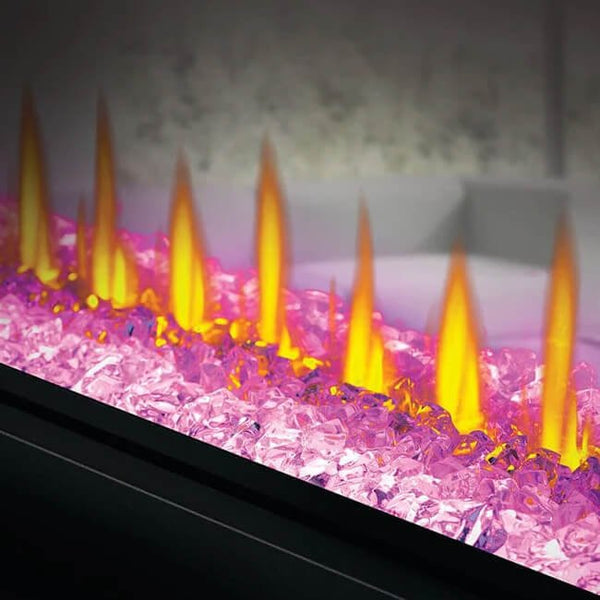 - Fifteen different ember bed color options; orange, red, blue, yellow, green, purple, sky blue, purple/red, white, pink, yellow/green, ice blue, orange/red, light green, magenta plus an autocycle setting