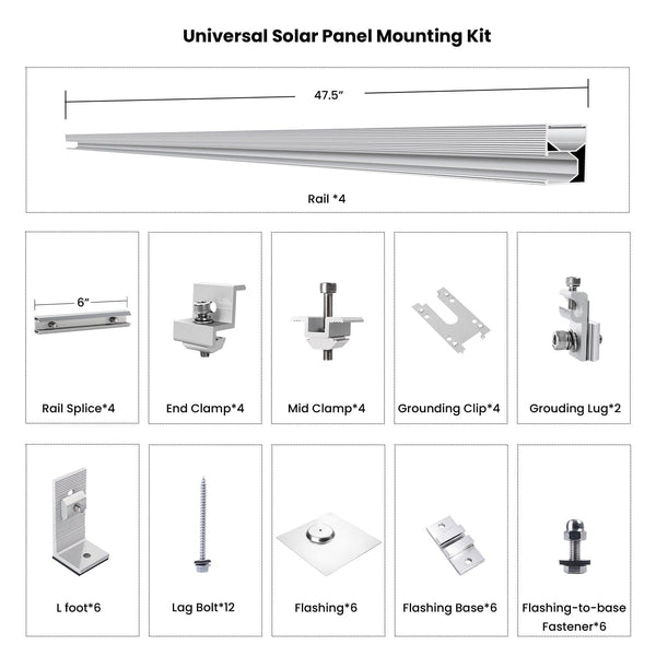 • Complete Mounting Kit: Includes rails, clamps, footings, grounding lugs, and hardware needed for a secure solar panel installation.