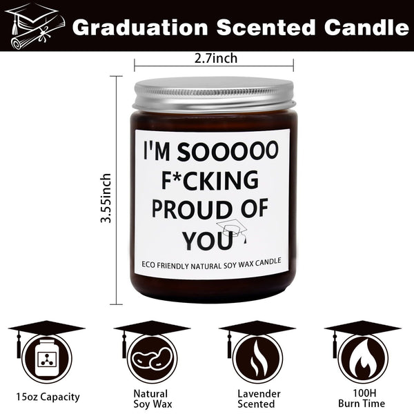 Funny Graduation Gift:Graduation candle is housed in a vintage glass with label saying ‘I’M SOOOOO PROUD OF YOU’. Funny congratulations message adding pizzazz to the graduation decorations.